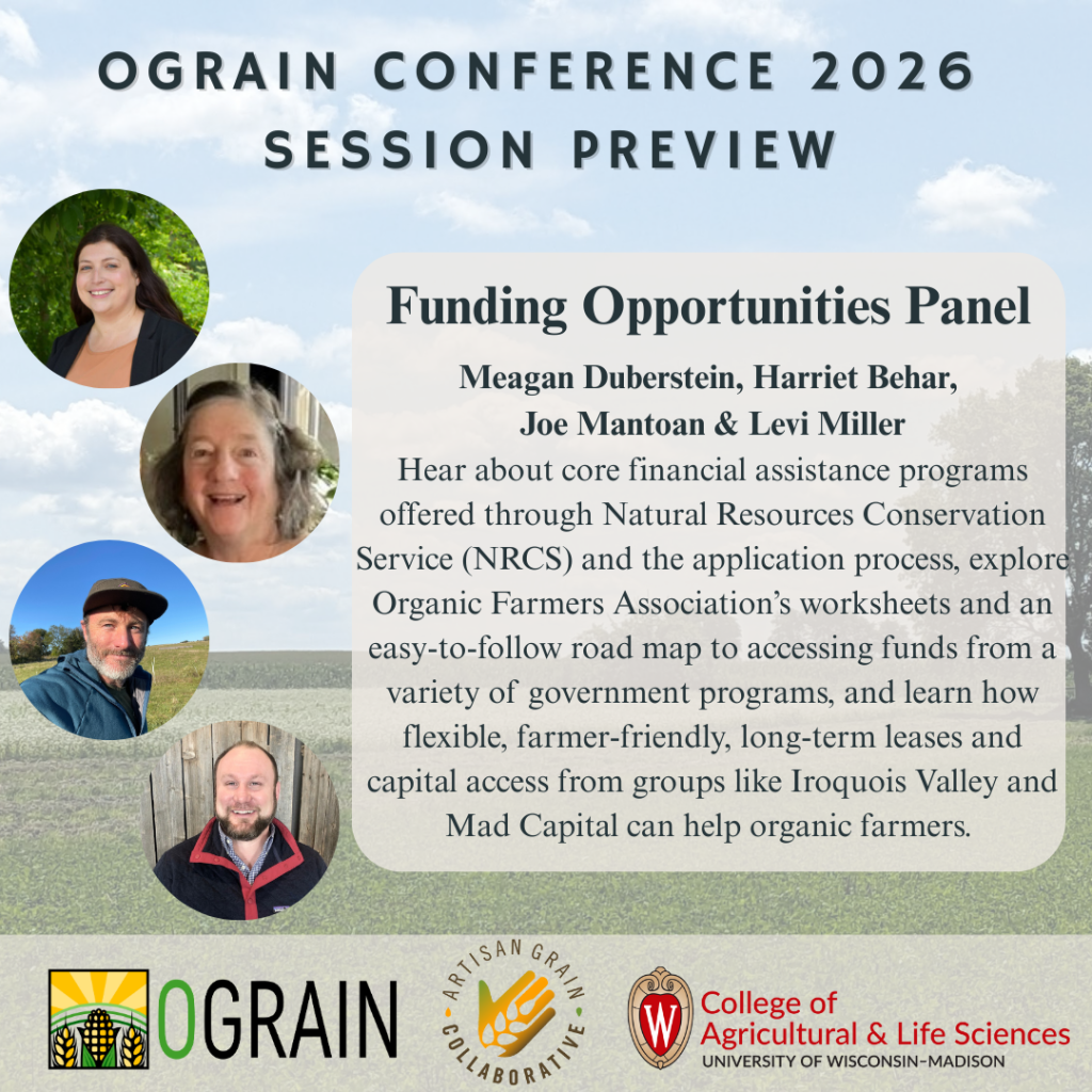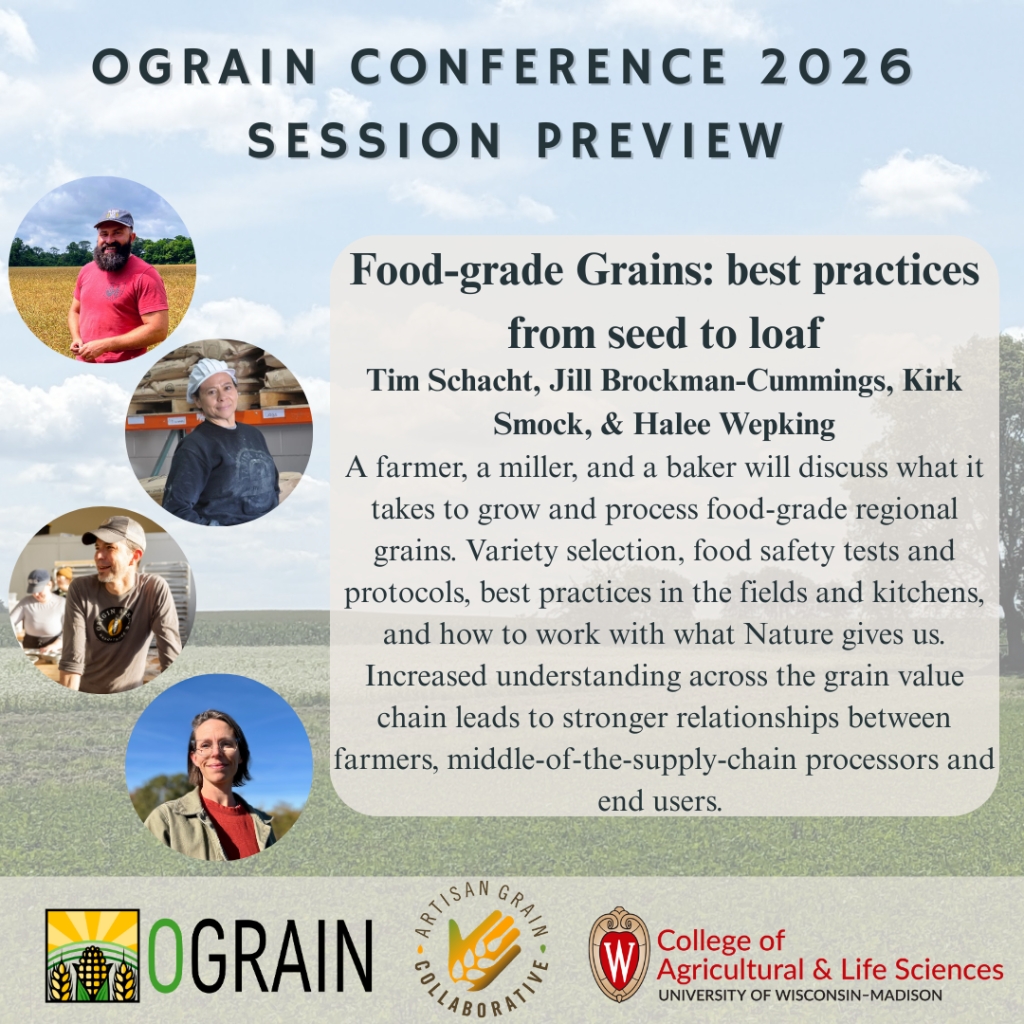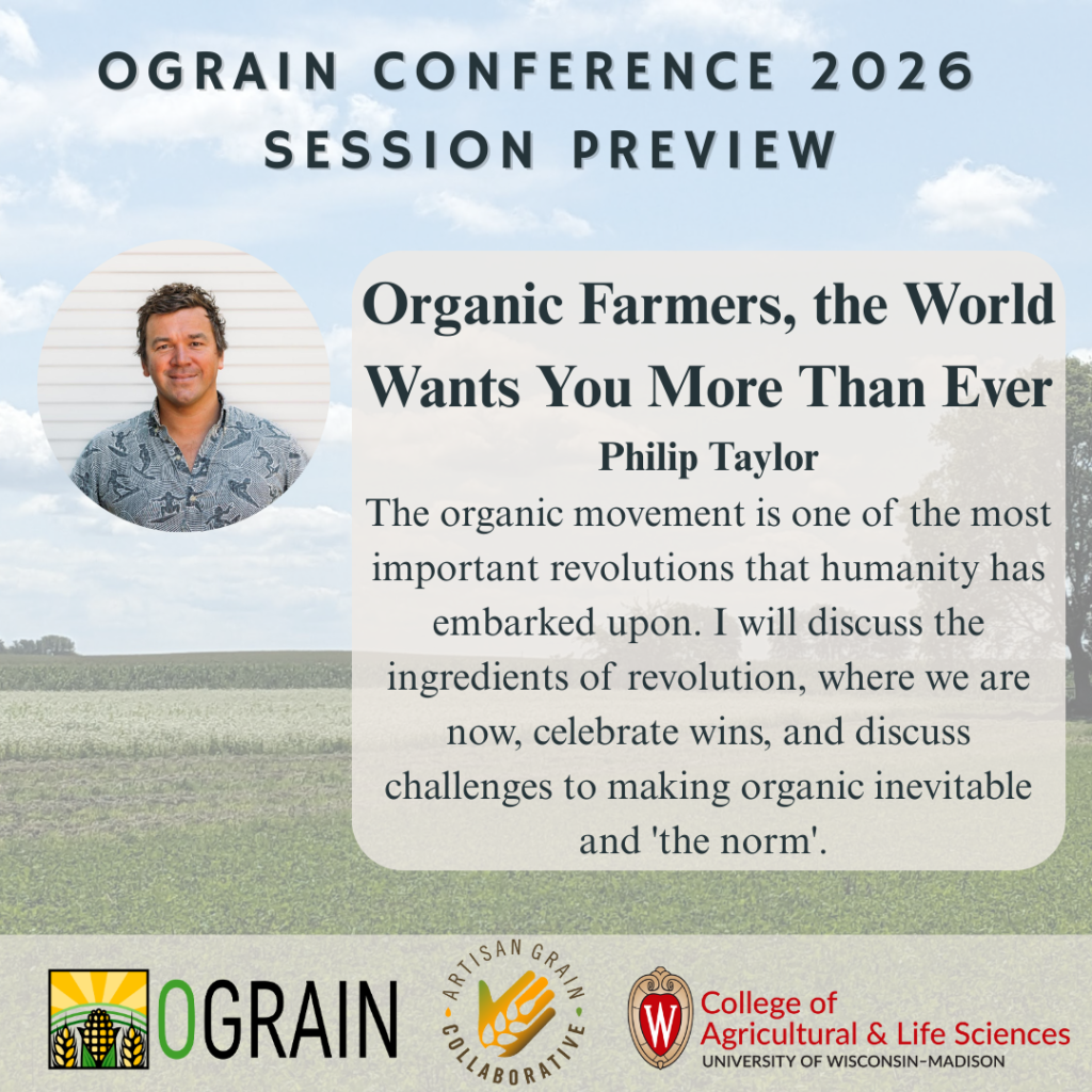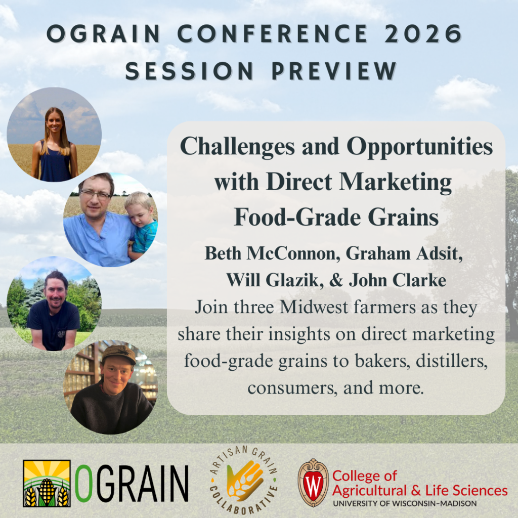 Join us January 22nd through 24th, 2026 at the Monona Terrace in Madison, WI! The annual OGRAIN Conference is an opportunity to learn from local organic grain growers, hear about the latest research, and connect with other organic, transitioning-to-organic, or inquisitive-about-organic grain growers and end-users.