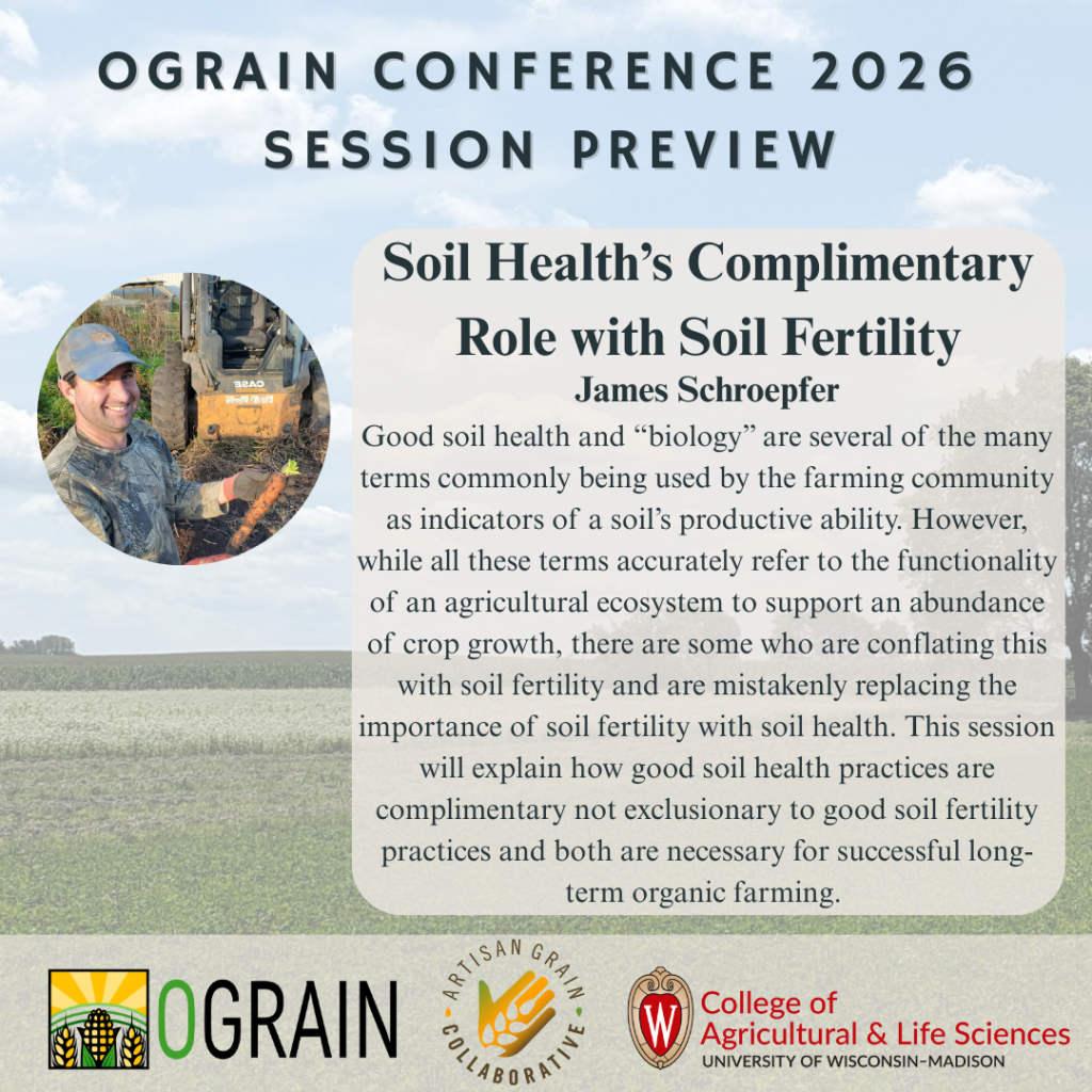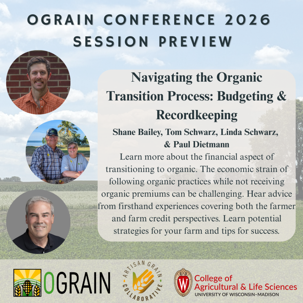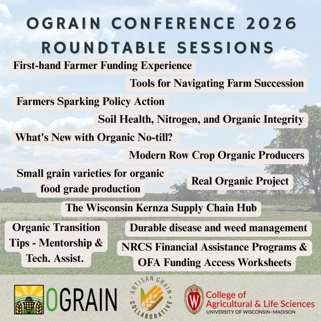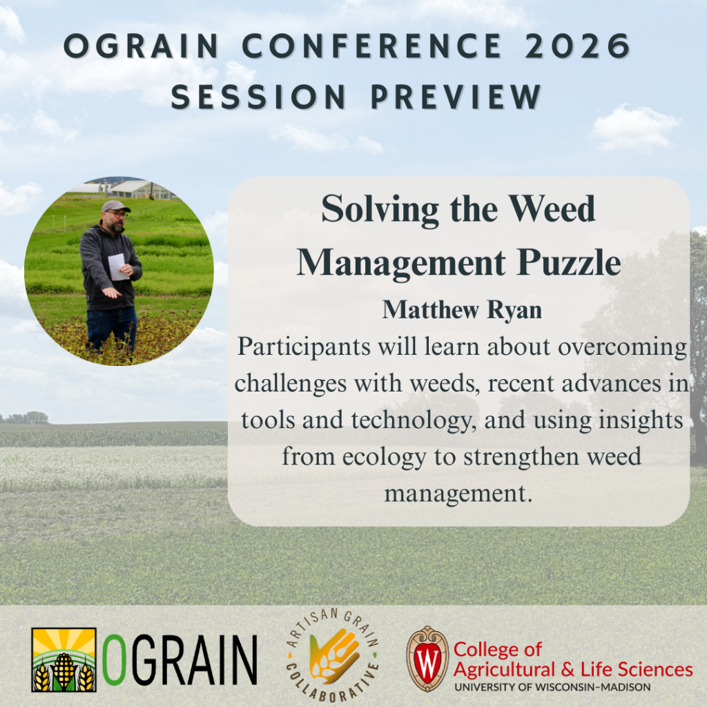 Join us January 22nd through 24th, 2026 at the Monona Terrace in Madison, WI! The annual OGRAIN Conference is an opportunity to learn from local organic grain growers, hear about the latest research, and connect with other organic, transitioning-to-organic, or inquisitive-about-organic grain growers and end-users.