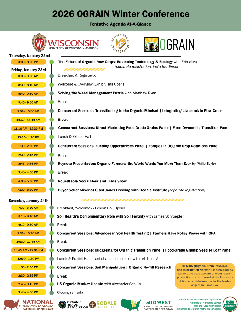 Thursday, January 22, 2026: *Thursday event is SOLD OUT* There will be an evening gathering, The Future of Organic Row Crops: Balancing Technology & Ecology, led by Erin Silva at the Monona Terrace from 3:00 – 8:00 pm. Join us for an evening of dinner and discussion led by farmers, researchers, and industry professionals (this requires an additional registration).