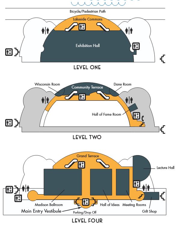 Take the skywalk to the Monona Terrace Convention Center. This will bring you to Level 5. Take the elevator to Level 4 and proceed down the hallway to reach the main entrance/center doors. A guest services attendant will be available at the desk at this entrance.